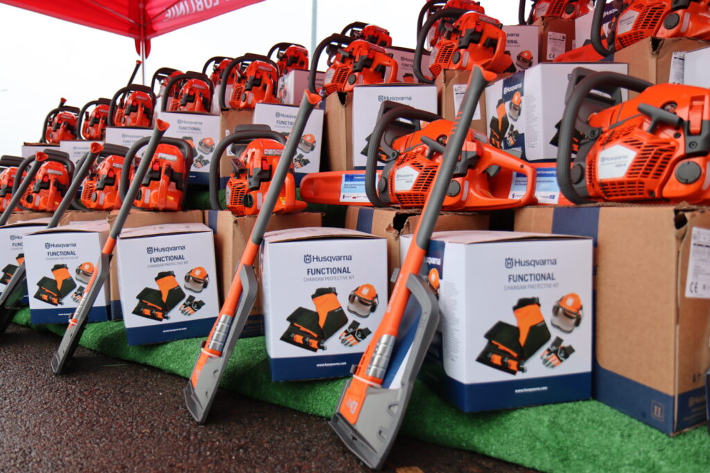 (pilarka łańcuchowa, siekiera rozłupująca, zestaw klinów do obalania drzewa, sprzęt ochronny: hełm z osłoną twarzy i nausznikami, rękawice skórzane, nogawice)
