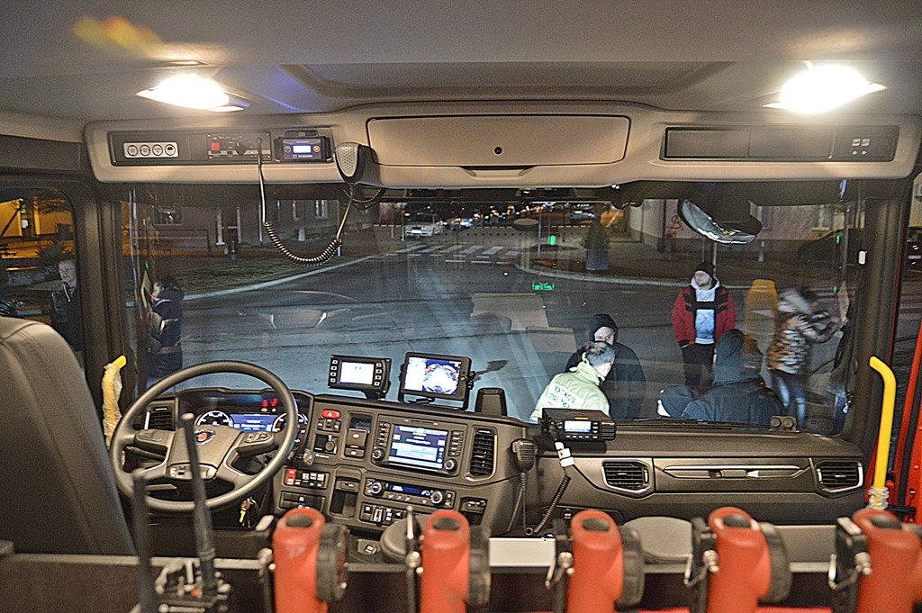 SCANIA została również wyposażona w teleskopowy maszt z najaśnicami, wciągarkę elektryczną o sile uciągu blisko 10 ton, zwijadło z nadciśnieniową linią szybkiego natarcia, instalację zraszaczy podwoziowych i kącik sanitarny. To co wyróżnia samochód spośród wielu podobnych to chociażby obecność działka wodno-pianowego zamontowanego na przodzie kabiny samochodu. Działkiem można sterować z kabiny za pomocą joysticka. Inną ciekawostką jest urządzenie gaśniczo-tnące CutLanca.
