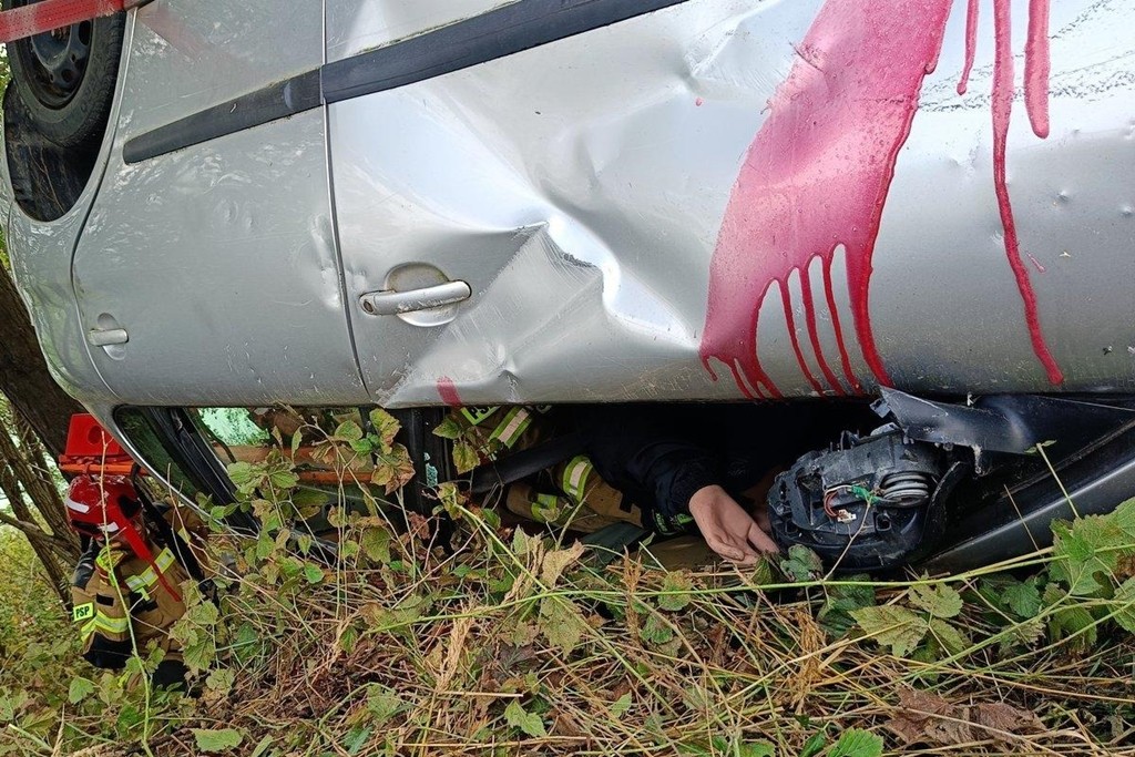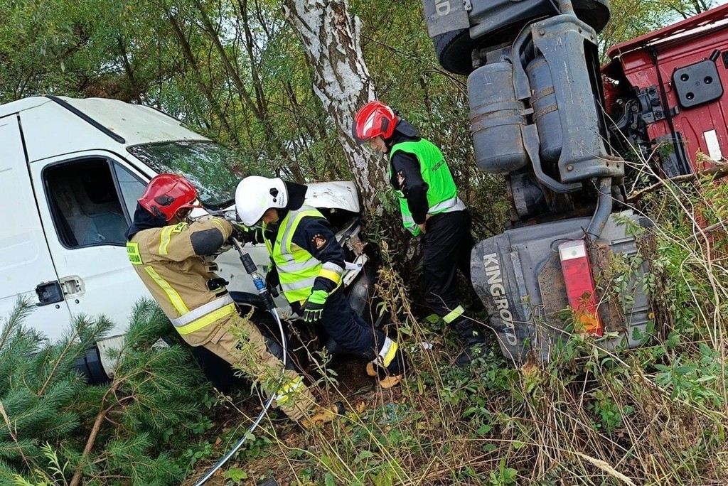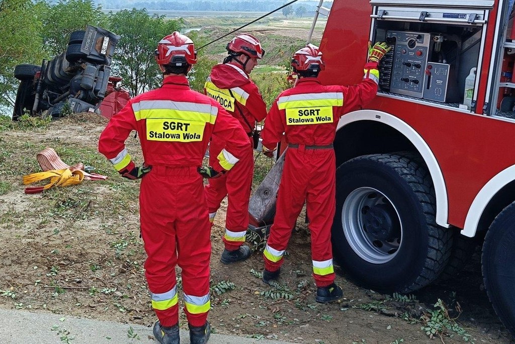 Wypadek drogowy w Czarnej Sędziszowskiej z udziałem samochodu ciężarowego, autobusu i dwóch samochodów osobowych. Dwie osoby uwięzione, autobus zawisł na skarpie przy zbiorniku wodnym, wyciek płynów eksploatacyjnych do wody.