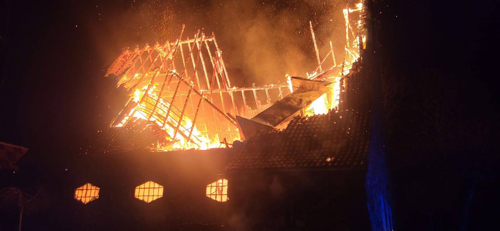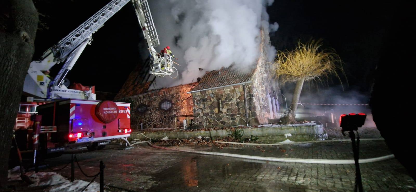 Po przybyciu na miejsce zdarzenia pierwszych sił i środków z Jednostki Ratowniczo-Gaśniczej w Wołowie Kierujący Działaniem Ratowniczym w wyniku przeprowadzonego rozpoznania ustalił, że doszło do pożaru Kaplicy Cmentarnej, a obiekt całkowicie objęty jest pożarem.